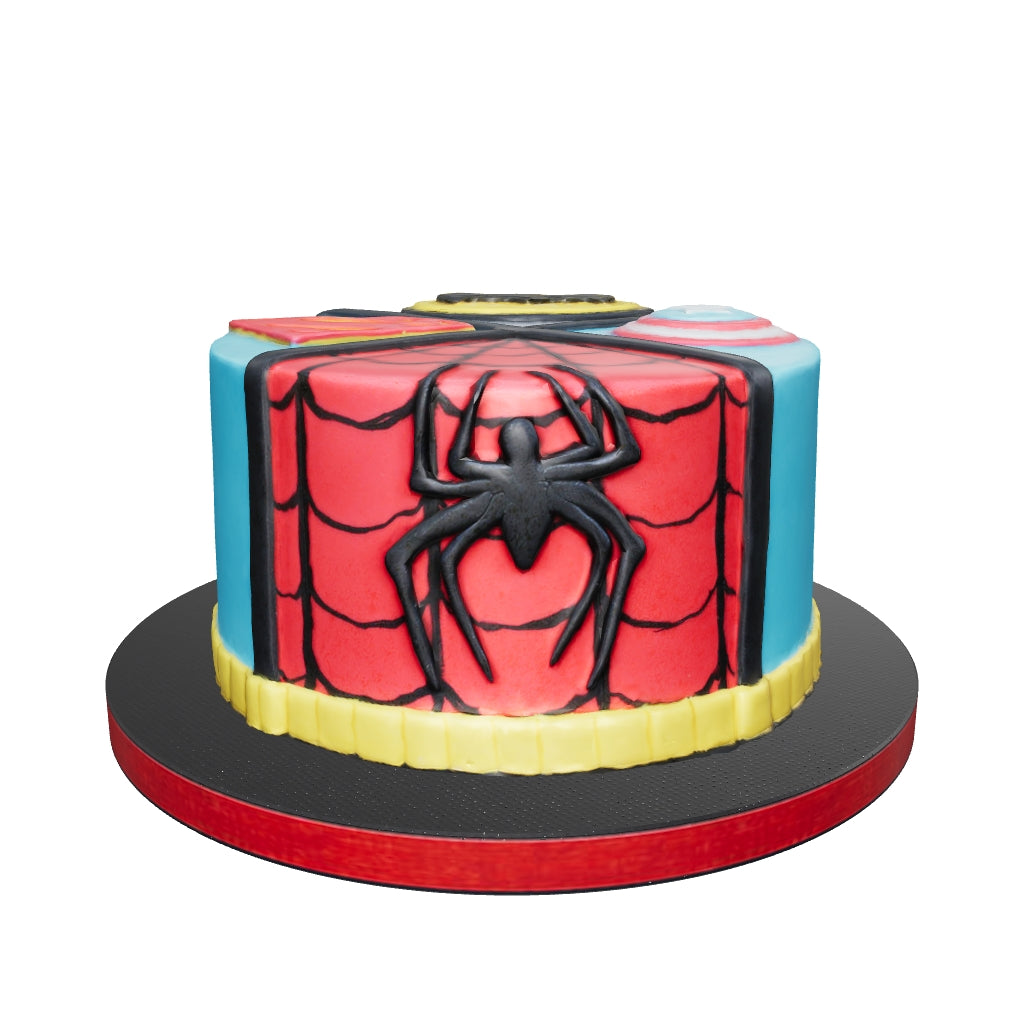 Round cake with four characters sharing the cake top. Finished with the personalised message on the board.