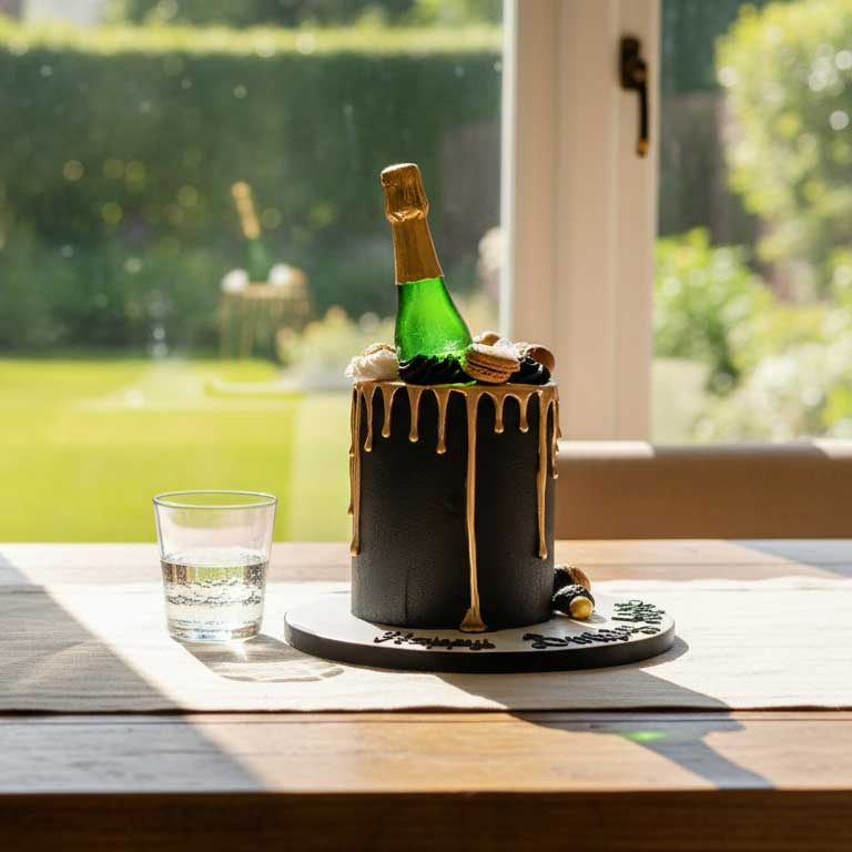 At the heart of the design are striking, making it the perfect centrepiece for milestone birthdays. Standing tall alongside is our signature hand-crafted Half Height Champagne Bottle—an 'edible glass' wonder created with premium Isomalt (powered by Edibottle). Each bottle is meticulously cast for crystal emerald clarity and hand-painted in a lustrous gold finish to exude pure luxury.